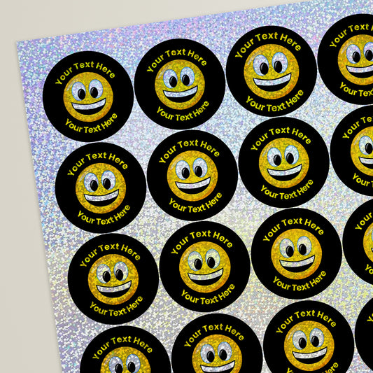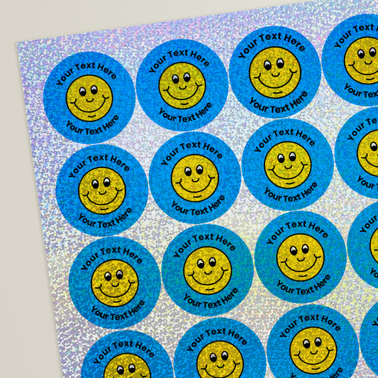 35 Personalised Holographic Smiley Stickers - 37mm