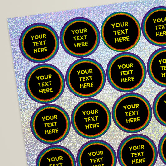 35 Personalised Holographic Neon Rainbow Circle Stickers - 37mm
