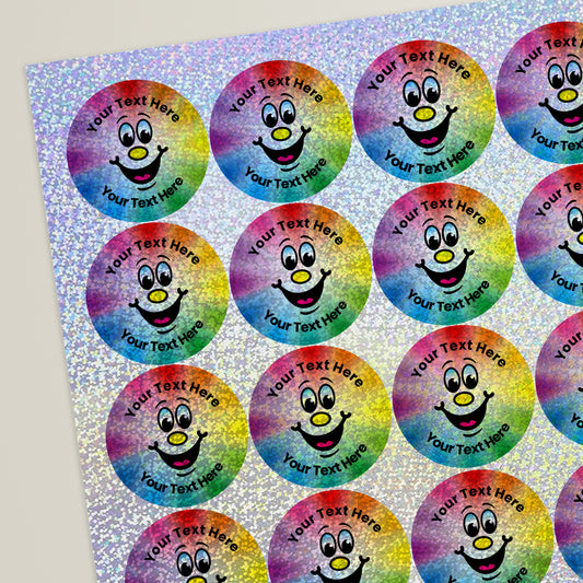 35 Personalised Holographic Rainbow Smiley Stickers - 37mm
