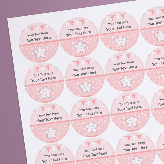 35 Personalised Smiley Star Baby Shower Stickers - 37mm