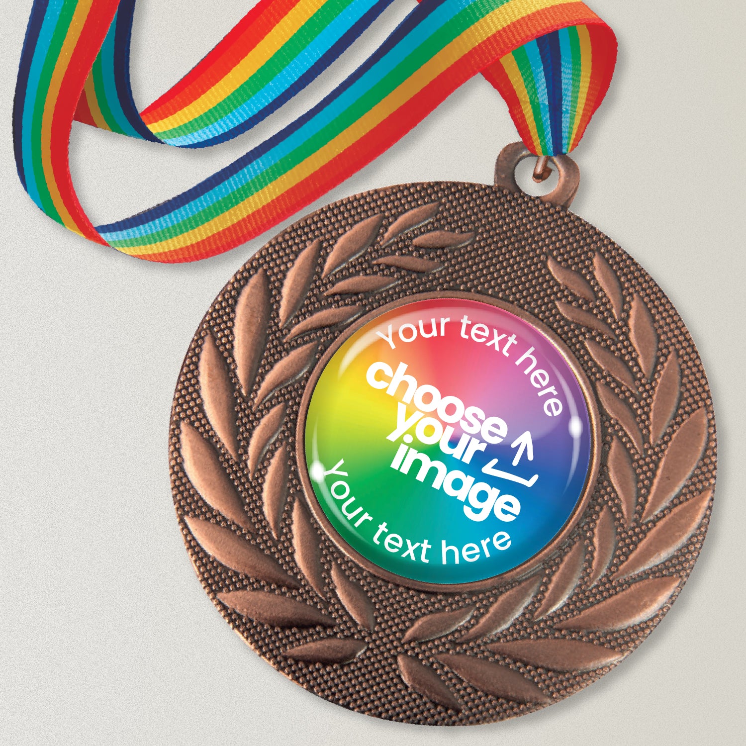 To create your unique medals choose a ribbon colour, background colour/design and add your wording. You can also add an image from our image bank or upload your own logo.