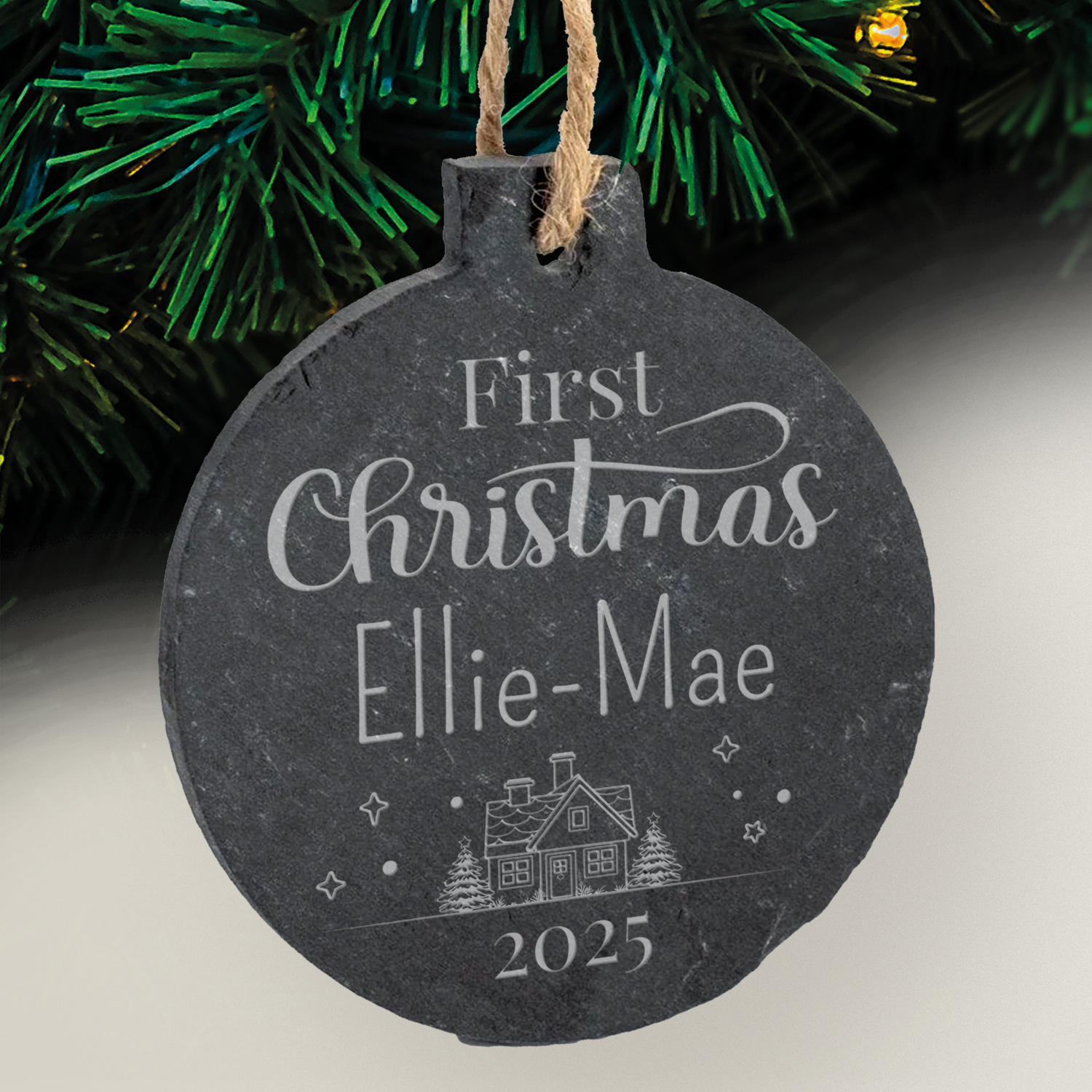 Add your wording to this, 'First Christmas' design slate bauble to create a unique and long-lasting festive ornament for your Christmas tree. They make perfect Christmas gifts for friends and family.