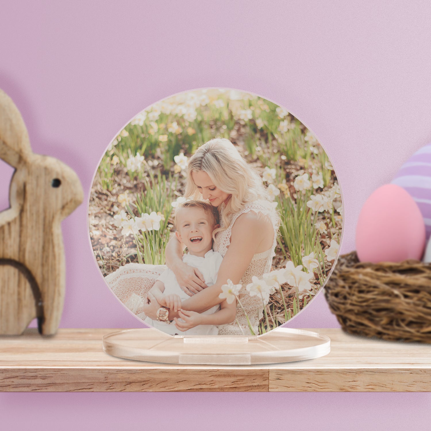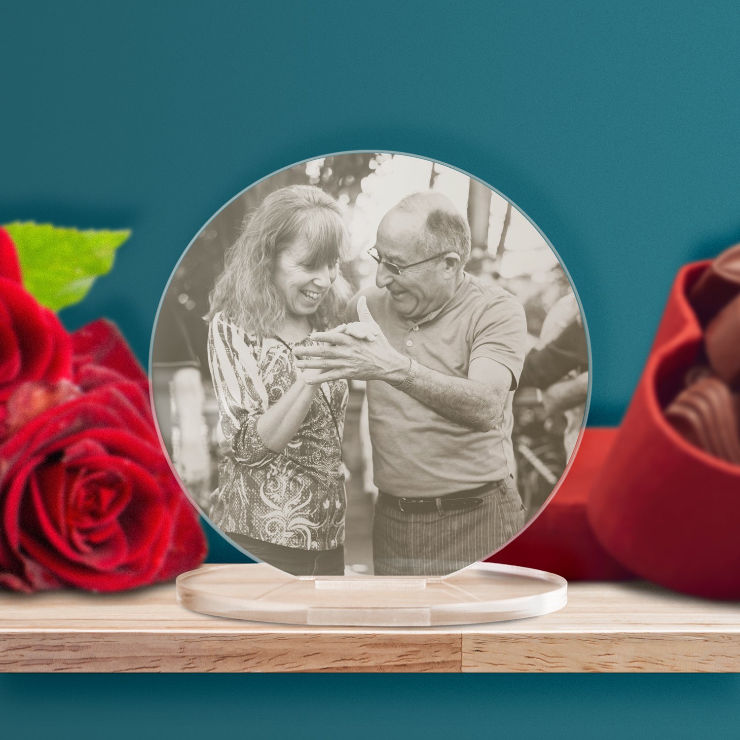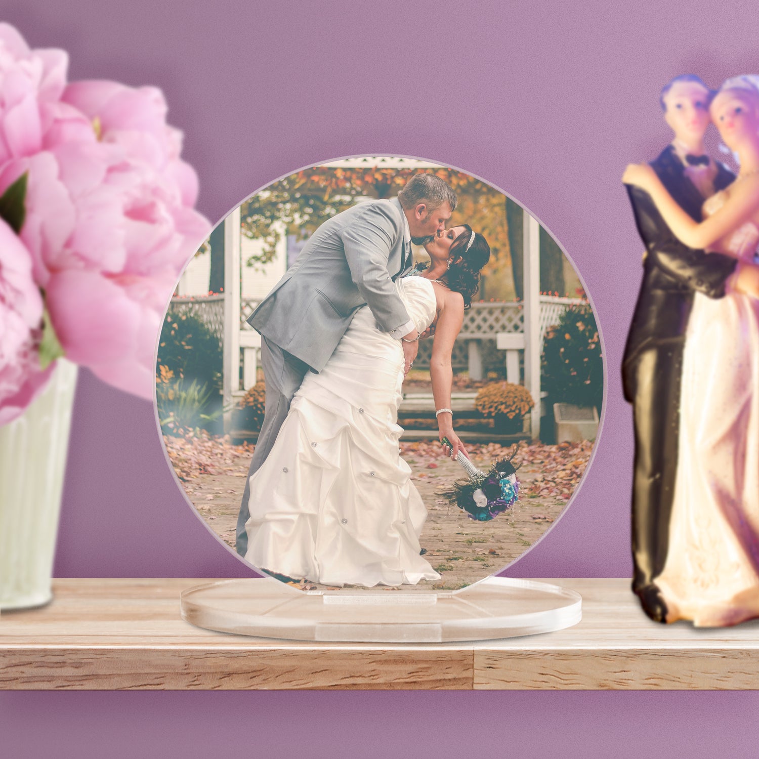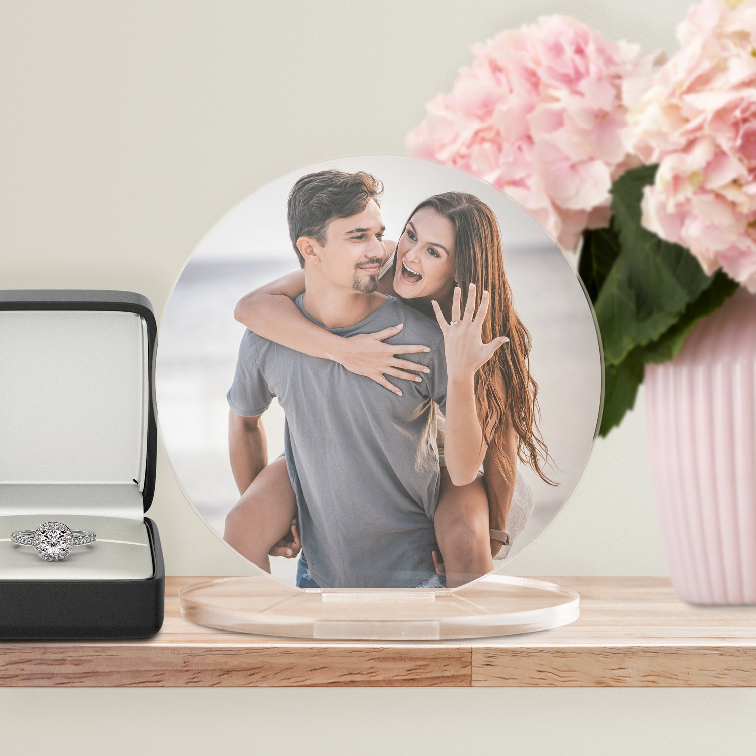 Add your own photo to this circular acrylic plaque to create a unique engagement gift or memento. Your design will printed onto a 100mm diameter circle which is 3mm thick and arrives with an acrylic stand.