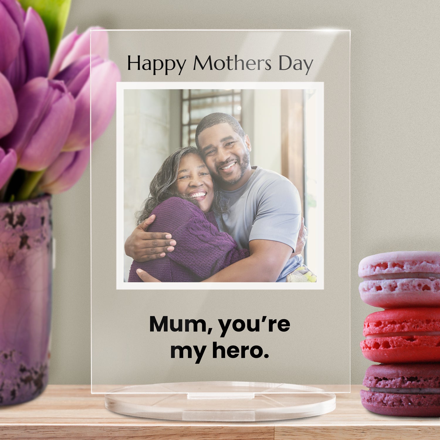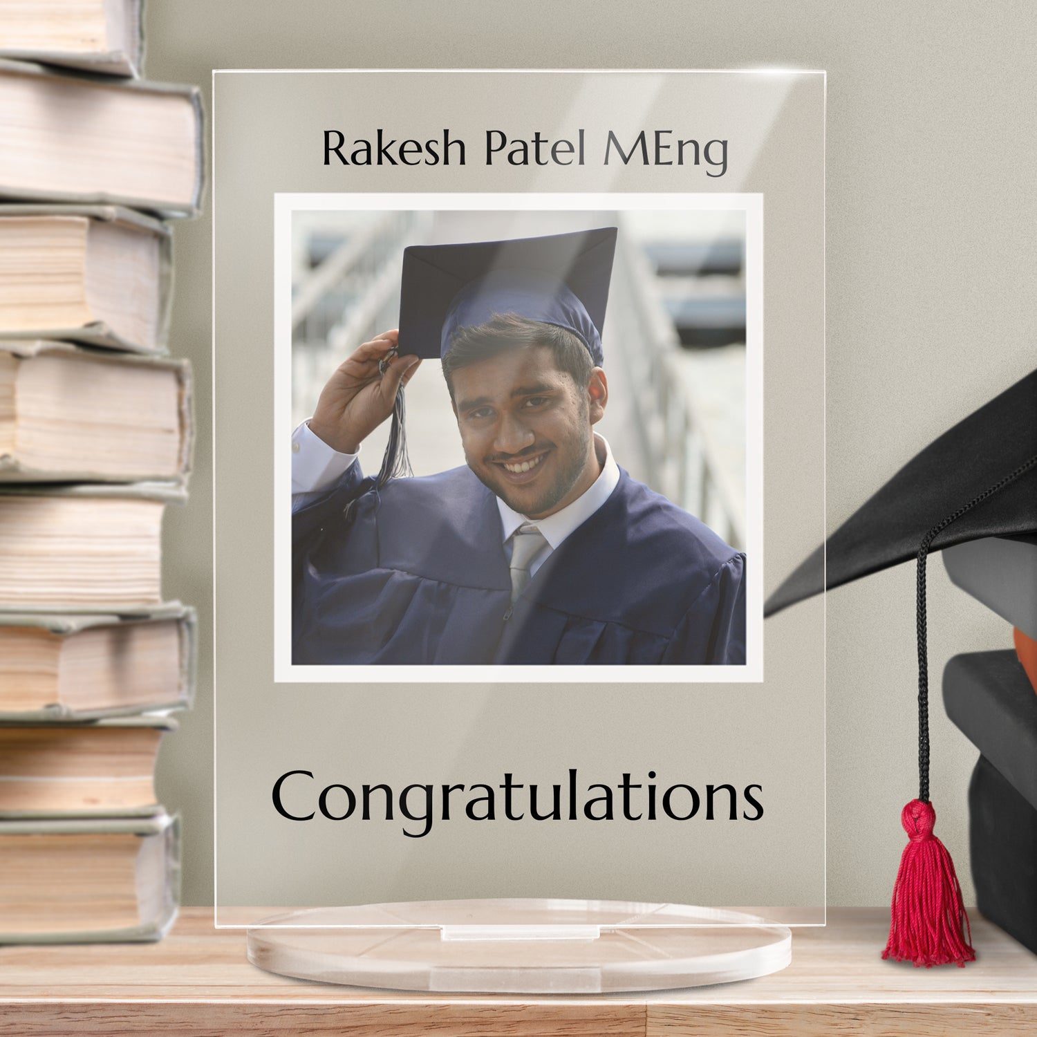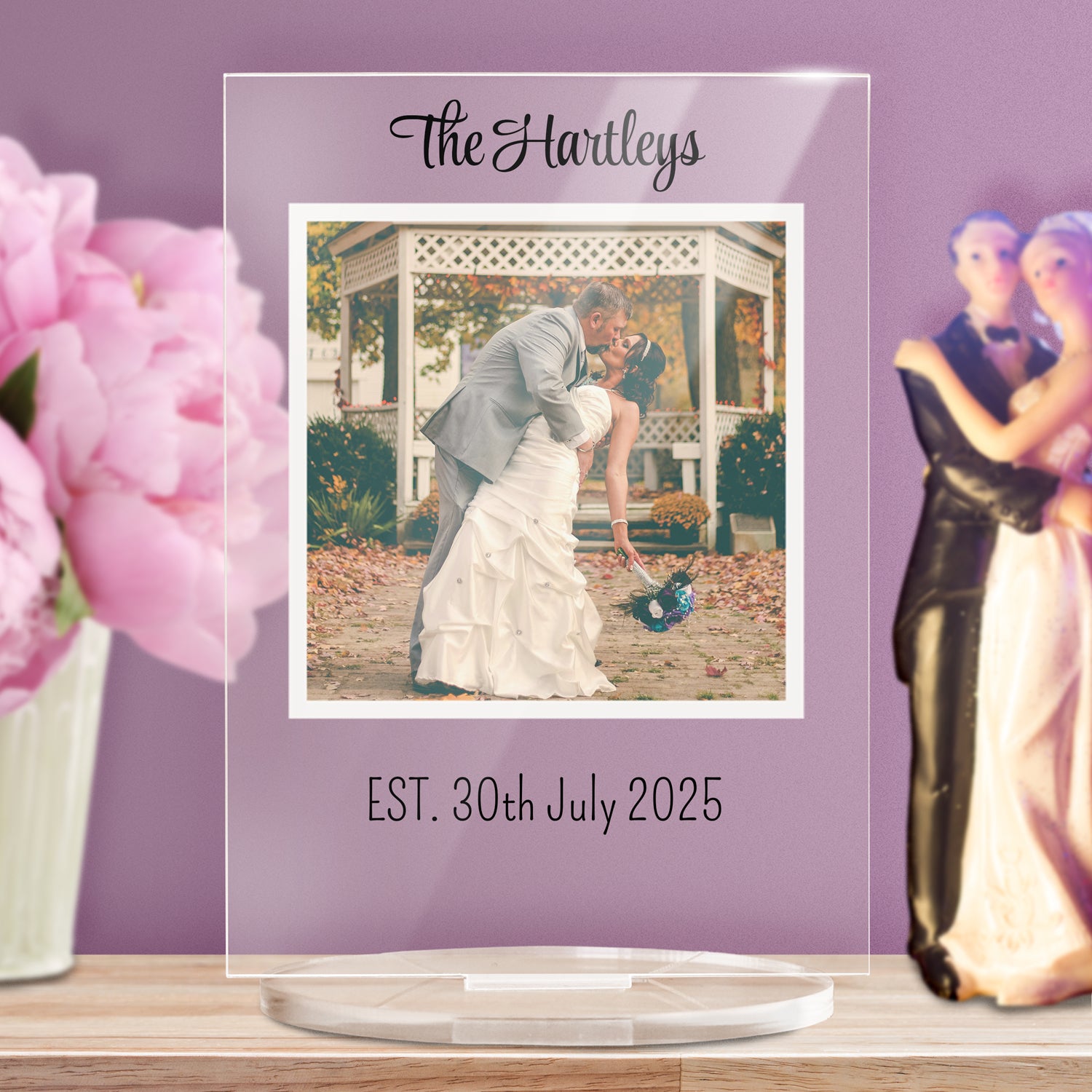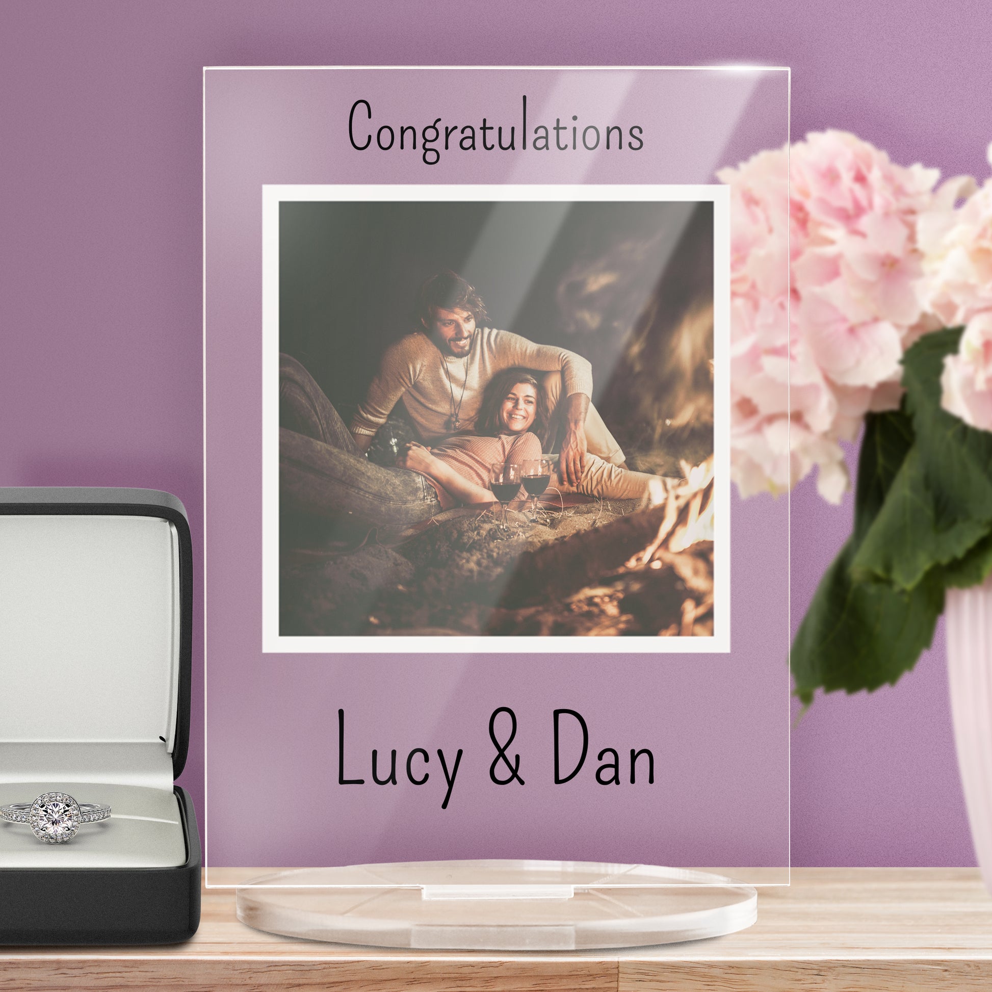 Add your own wording and upload a photo on this rectangular acrylic plaque to create a unique Engagement gift or memento. Your design will printed onto a 140mm x 100mm rectangle which is 3mm thick and arrives with an acrylic stand.
