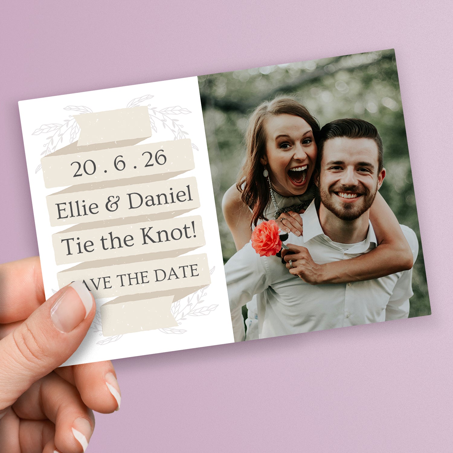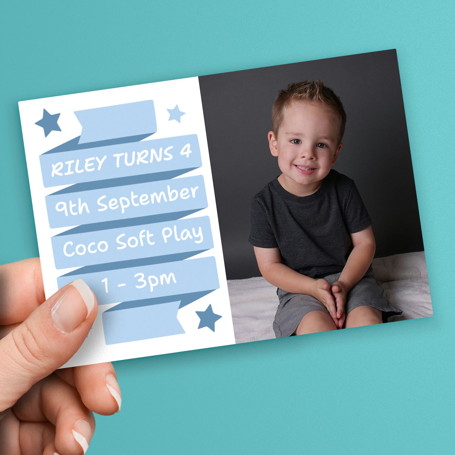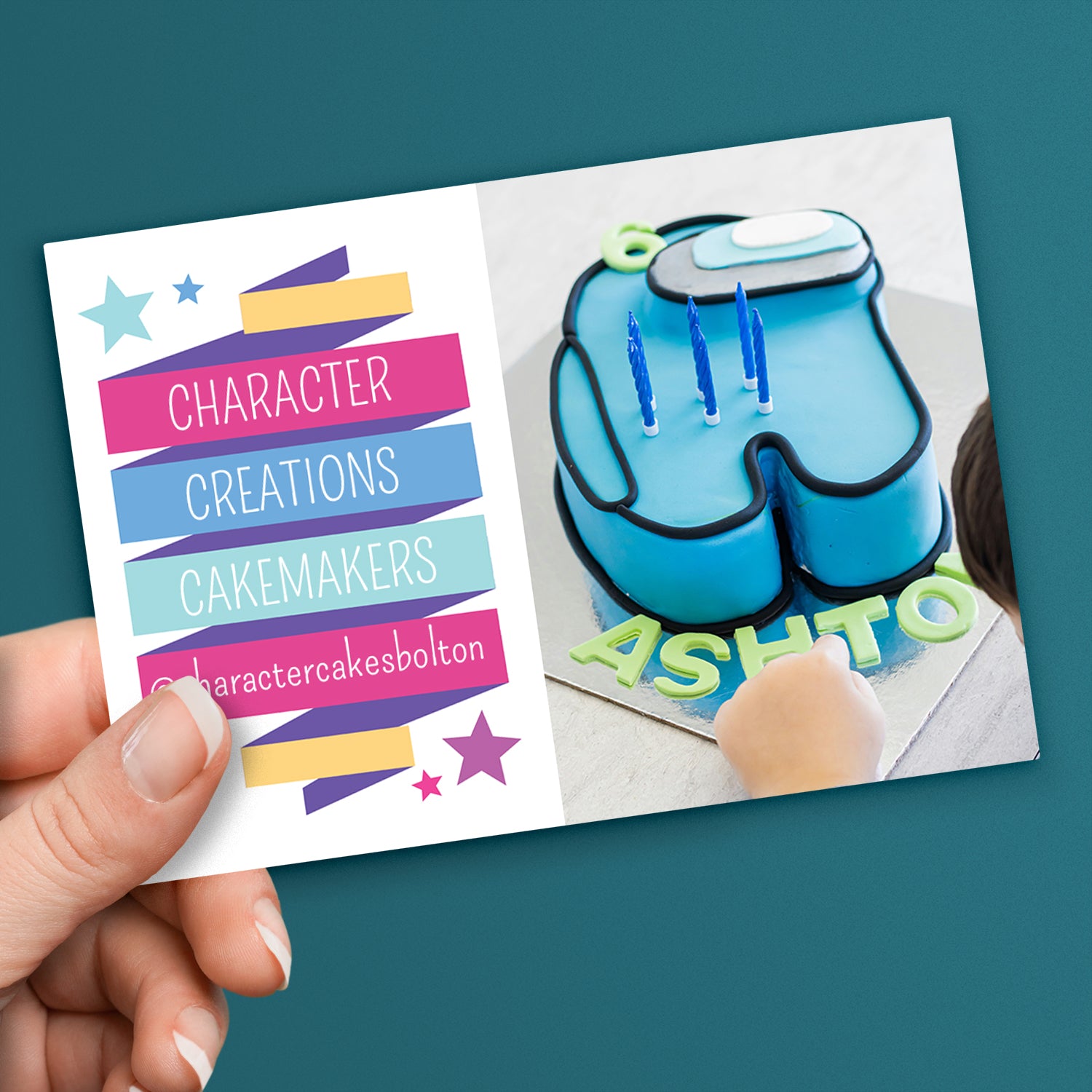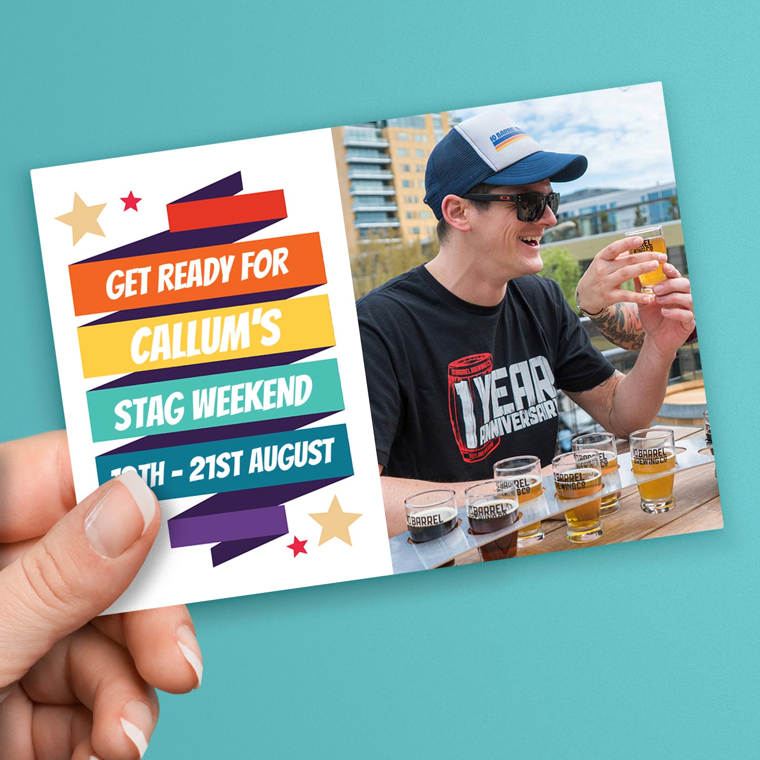 Upload your own photo or logo on one side of this 50/50 split postcard and choose a banner style for your text! Ideal for promoting yourself or saying thank you to customers.
