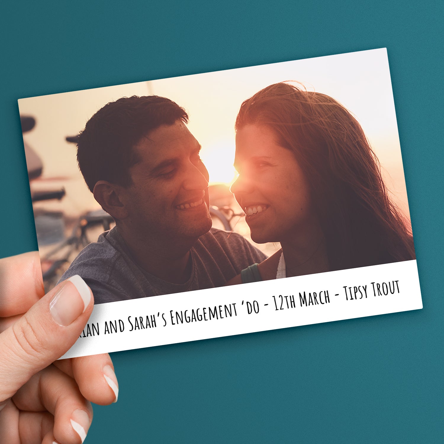 Upload your own photo to this postcard and add your own wording on a colour banner of your choice! Perfect for sending out engagement announcements or party invitations.